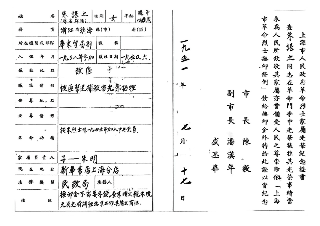 1950年6月10日16时30分,台北马场町刑场,朱谌之身中6枪,壮烈牺牲,时年45岁。与她一同被害的是国民党“国防部”参谋次长吴石、“国防部”高参陈宝仓,以及曾任吴石副官的上校聂曦。这起涉及国民党在台级别最高将领的“间谍案”轰动一时。