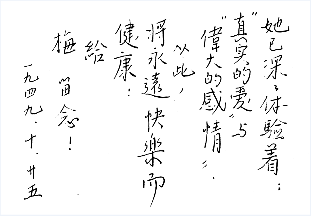 《朱枫传》作者、南京作家冯亦同生前曾接受采访。他说,临行前,朱枫曾寄给丈夫朱晓光一张照片,从照片背面的留言可以看出,朱枫是怀着极大的牺牲决心和对亲人的无限思念前往台湾的。照片中,穿着短袖的朱枫静静地坐在铺着格子桌布的茶几旁。照片背面写道:“她已深深体验着:‘真实的爱’与‘伟大的感情’,从此,将永远快乐而健康!”